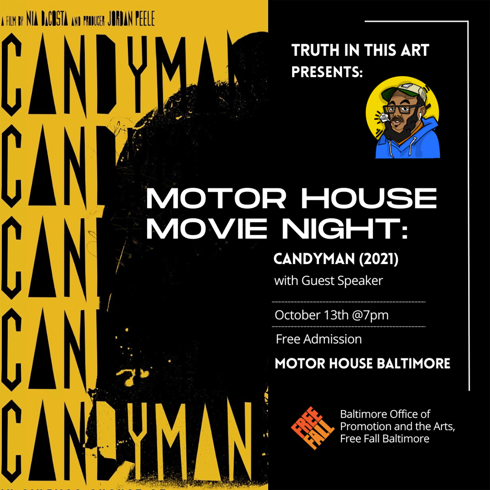 No need to say his name 5 times. Candyman (2021), directed by Nia DaCosta and written by Jordan Peele, Win Rosenfeld and Nia DaCosta, is coming to Motor House on October 13th at 7pm. Come through for this community movie night. Rob Lee, host of Best of Baltimore podcast, The Truth in this Art welcomes founder of Blackives· Maryland Institute Black Archives, Deyane Moses, for a conversation about the feature and film trivia.