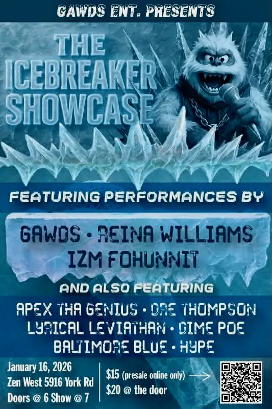 Gawds Ent. Presents "THE ICE BREAKER SHOWCASE" celebrating Baltimore's hip-hop and rap artists. This extravaganza takes place on January 16, 2026, at Zen West 5916 York Road, featuring standout performances by GAWDS, Reina Williams, and IZM Fohunnit. Other featured artists include Apex the Genius, Dre Thompson, Lyrical Leviathan, Dime Poe, Baltimore Blue, and Hype.