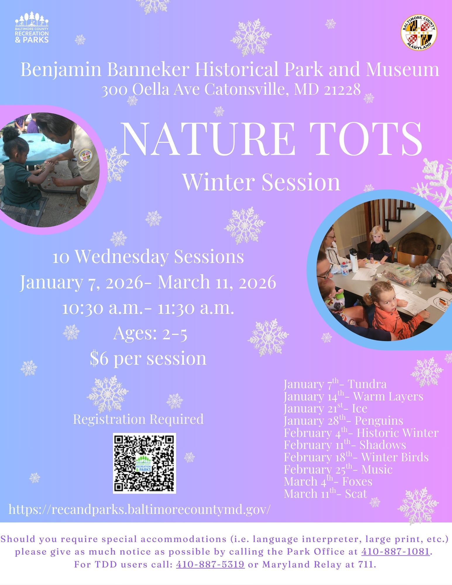 Enjoy time in nature with your little one! Lots of seasonal hands-on activities that encourage nature exploration. A portion of the class will be held outside, so please dress for the weather.