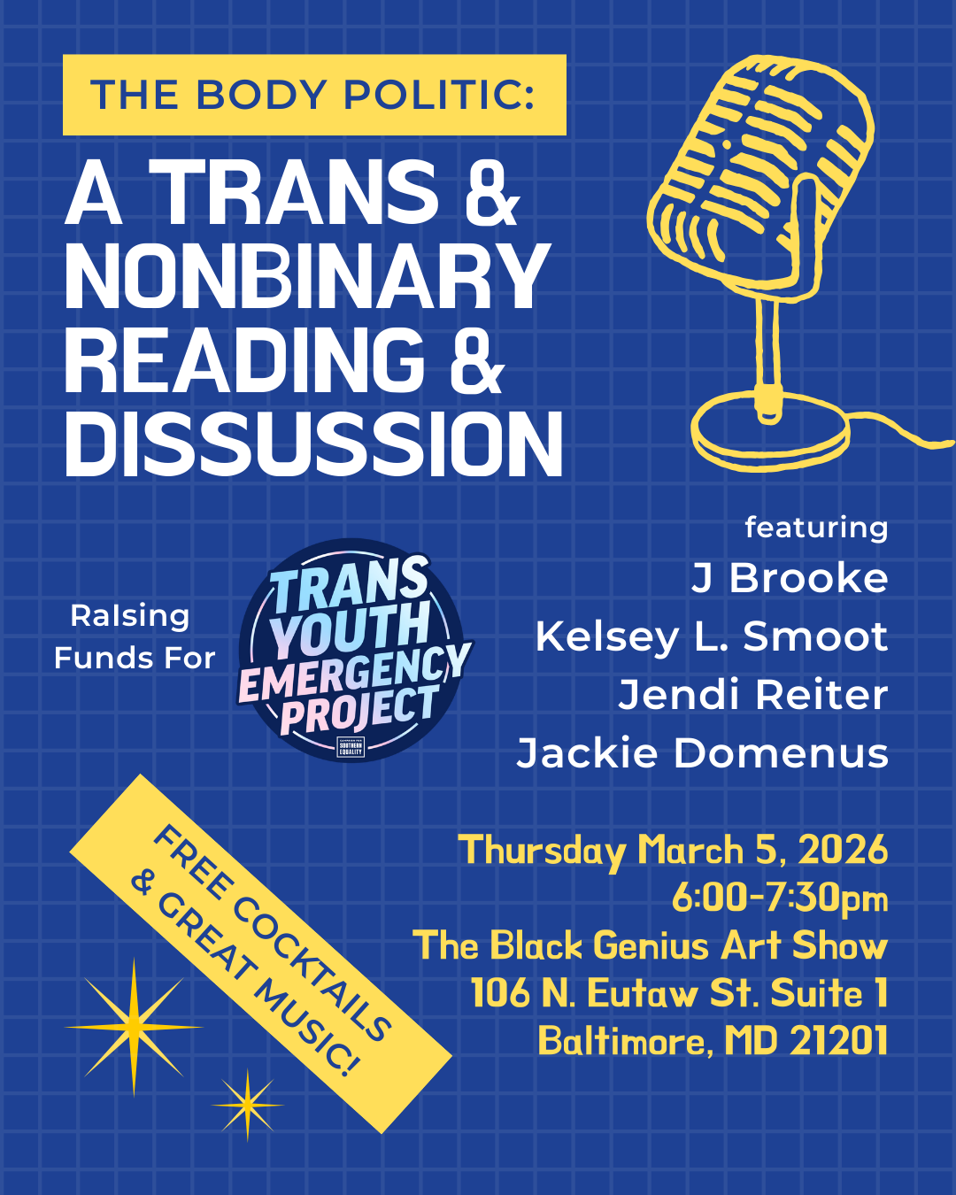 Join trans and nonbinary writers J Brooke (I Can Tell You The Version That Will Make You Take My Side, 2026), Kelsey L. Smoot (SOULMATE AS A VERB, 2026), Jendi Reiter (Introvert Pervert, 2026), and Jackie Domenus (No Offense: A Memoir in Essays, 2025), for readings and an open discussion on work engaging with gender and the physical manifestation of it. Fun, free cocktails (yes, buried the lede there), and great music by Baltimore’s very own Queen HD.