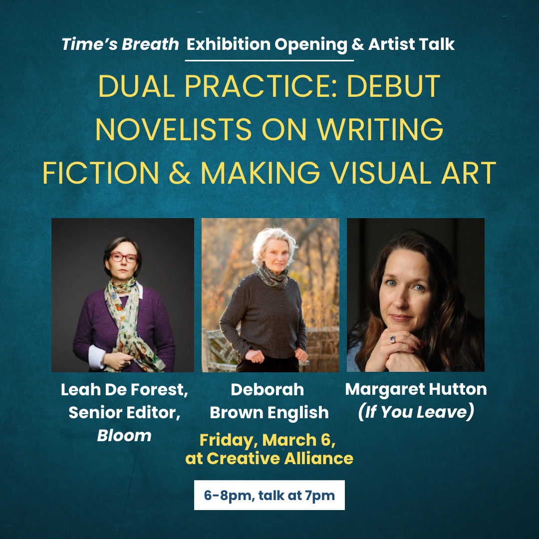 In this “Time’s Breath" art exhibition public opening and artist talk, Boston-based author Leah De Forest, Senior Editor of Bloom, an online magazine devoted to authors whose first major work was published when they were age 40 or older, and forthcoming debut novelist (Any Kind of Known Tomorrow), discusses balancing art practices and the craft of writing fiction with Deborah Brown English (Time’s Breath), and artist and debut novelist, Margaret Hutton (If You Leave). Free and open to all.
