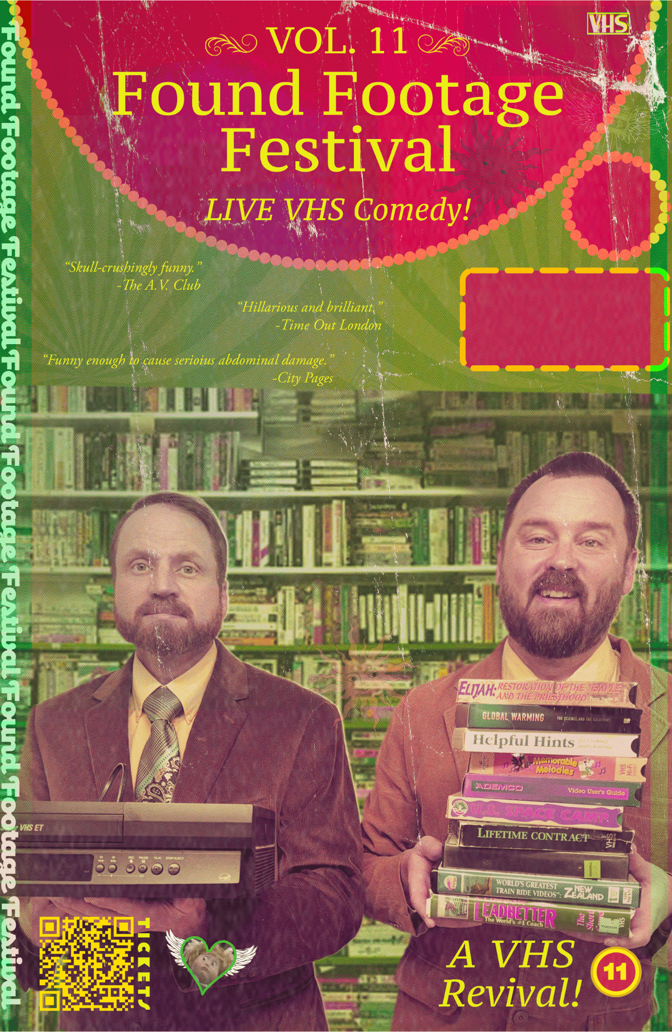 The Found Footage Festival is a one-of-a-kind celebration of VHS oddities—unearthed from dusty thrift stores, garage sales, and estate cleanouts across North America. Longtime friends Pickett and Prueher provide live commentary and “where-are-they-now” updates on their strangest finds, turning forgotten tapes into unforgettable comedy.