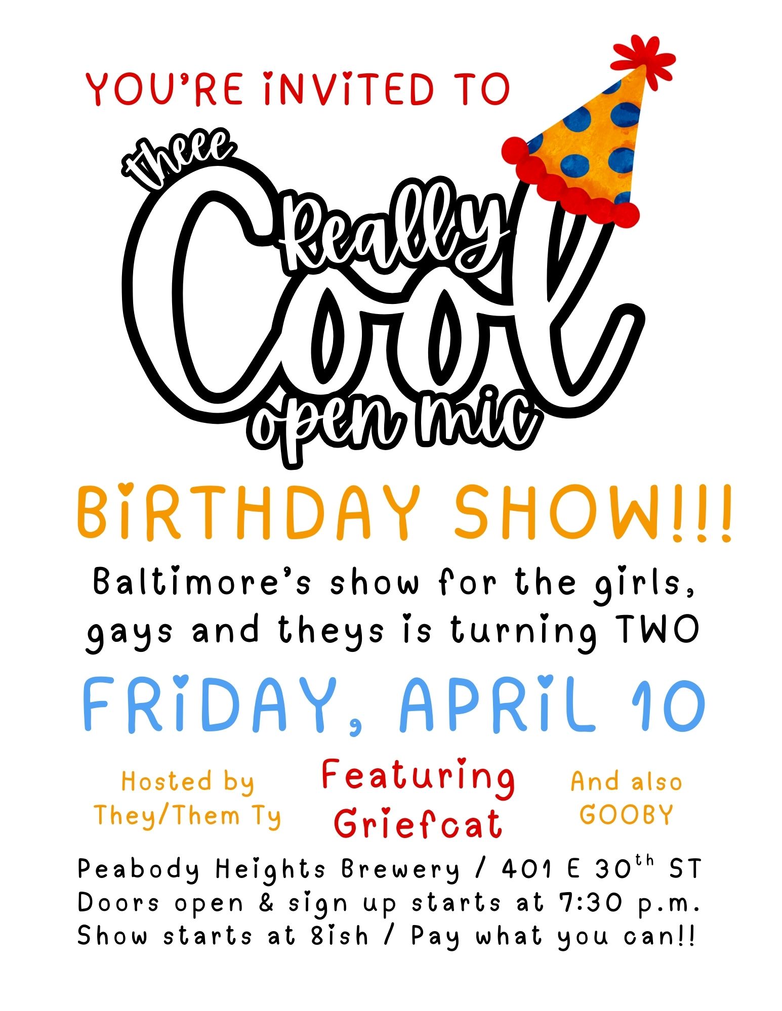 IT'S OUR BIRTHDAY!!!!! It's been two FAB years of building community, diverifying the Baltimore comedy scene and making each other LAUGH. Come celebrate our birthday with us and internet sensations Griefcat!!!