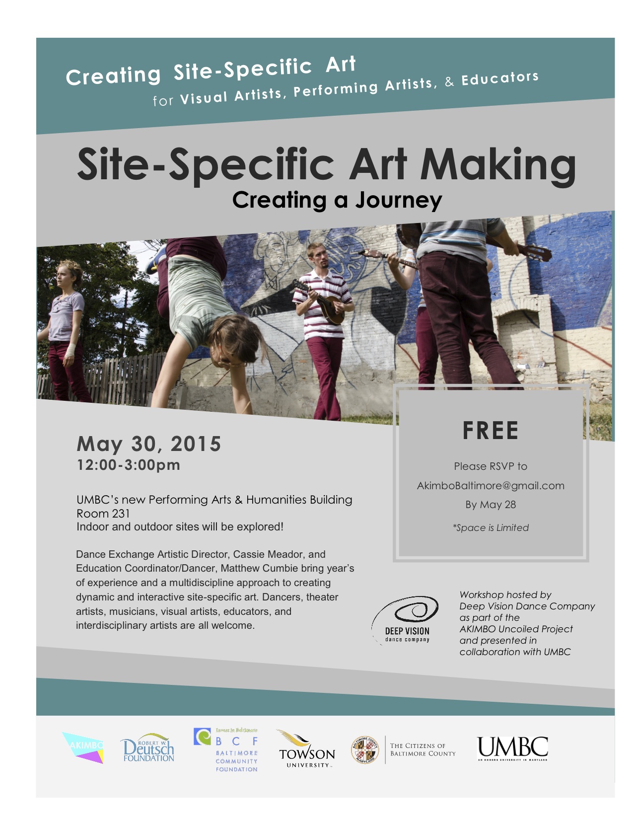 A free workshop for any and all artists. Dance Exchange Artistic Director, Cassie Meador, and Education Coordinator/Dancer, Matthew Cumbie, are creating a special workshop at UMBC’s new Performing Arts & Humanities building. Indoor and outdoor sites are explored. RSPV to [email protected]. Space is limited. Workshop hosted by Deep Vision Dance Company as part of the AKIMBO Uncoiled Project and presented in collaboration with UMBC.
